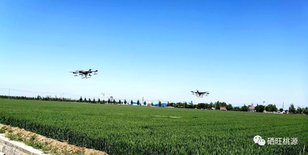 4月26日9時,顏送貴研究員、閔正富總經(jīng)理、弘祥公司董事長常向玉、副總經(jīng)理付玉柱、淄博臨淄區(qū)委書記劉正軍,親臨弘祥農(nóng)業(yè)有限公司西召村基地指導無人機噴施。550畝高硒小麥區(qū)噴施“糧食作物專用C型”(糧油節(jié)力高硒型)富硒葉面肥;5畝多礦物質(zhì)營養(yǎng)小麥區(qū)噴施“糧食作物專用E型”葉面肥。下午3時施硒結(jié)束;5月4日,湖南省瑞芳農(nóng)業(yè)科技發(fā)展有限公司總經(jīng)理閔正富再次親臨基地,現(xiàn)場指導富硒小麥噴施“糧食作物專用C型”葉面肥;多礦物質(zhì)營養(yǎng)小麥噴施糧食作物專用D型(多功能糧油型)葉面肥;6月5日收獲。由于本產(chǎn)品硒含量嚴重超標,加工面粉建議按1:1或1:2(高硒小麥:普通小麥)的比例,混合后加工,硒含量控制在0.5-1mg/kg為佳。